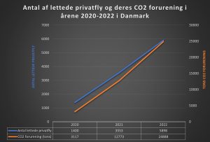 Ifølge rapporten CO2 emissions of private aviation in Europe (CE Delft, March 2023) er antallet at privatfly der letter fra Danmark steget fra 1.400 i 2020 til 5.898 i 2022. Dvs. en stigning på mere end fire gange på blot tre år.